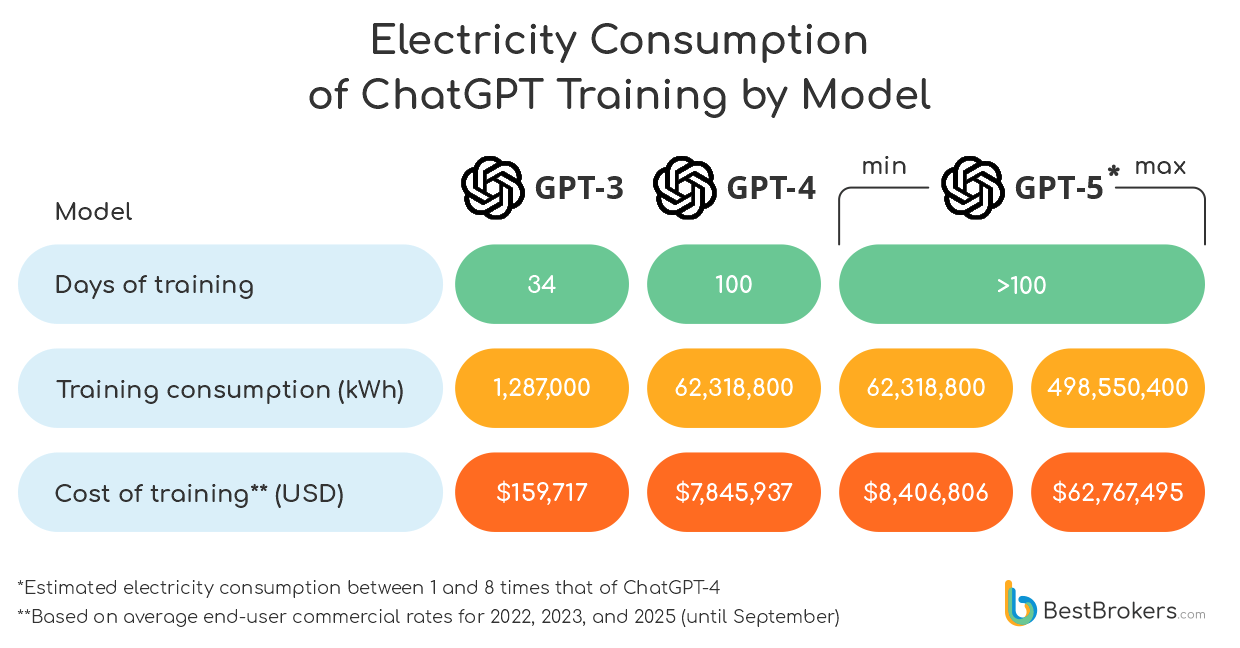 The current model, GPT‑5, which was officially released on August 7, 2025, is said to be much more powerful than previous iterations, with training data unavailable. In fact, OpenAI has not shared training times because they can reveal key information about the GPU cluster scale, hardware efficiency, compute budget, model architecture, and cost structure. Typically, to estimate power and water consumption, as well as the carbon footprint of a certain AI model, researchers use information about the number and type of GPUs used for training, training compute (FLOPs), training dataset size (tokens), and scaling patterns. However, for models such as GPT-4 and GPT-5, this information is not public.